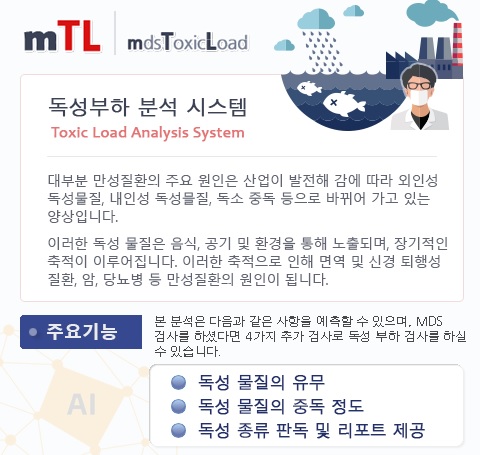 죽음을 부르는 환경독소 산업이 발전해감에 따라 환경오염은 더욱 심해져 만성질환 주요 원인 중 외인성 독성물질 중독(잔류성유기오염물질, 과불소화합물, 중금속, 플루오르화 화합물 등) 이 급격히 증가되어가고 있습니다. 이러한 독성물질은 음식, 공기, 및 환경을 통해 체내로 유입되며 우리 몸에서는 해 독이 잘 이루어지지 않아 장기적인 축적이 됩니다. 이러한 축적으로 인해 면역 및 신경 퇴행성 질환, 암, 당뇨병…
