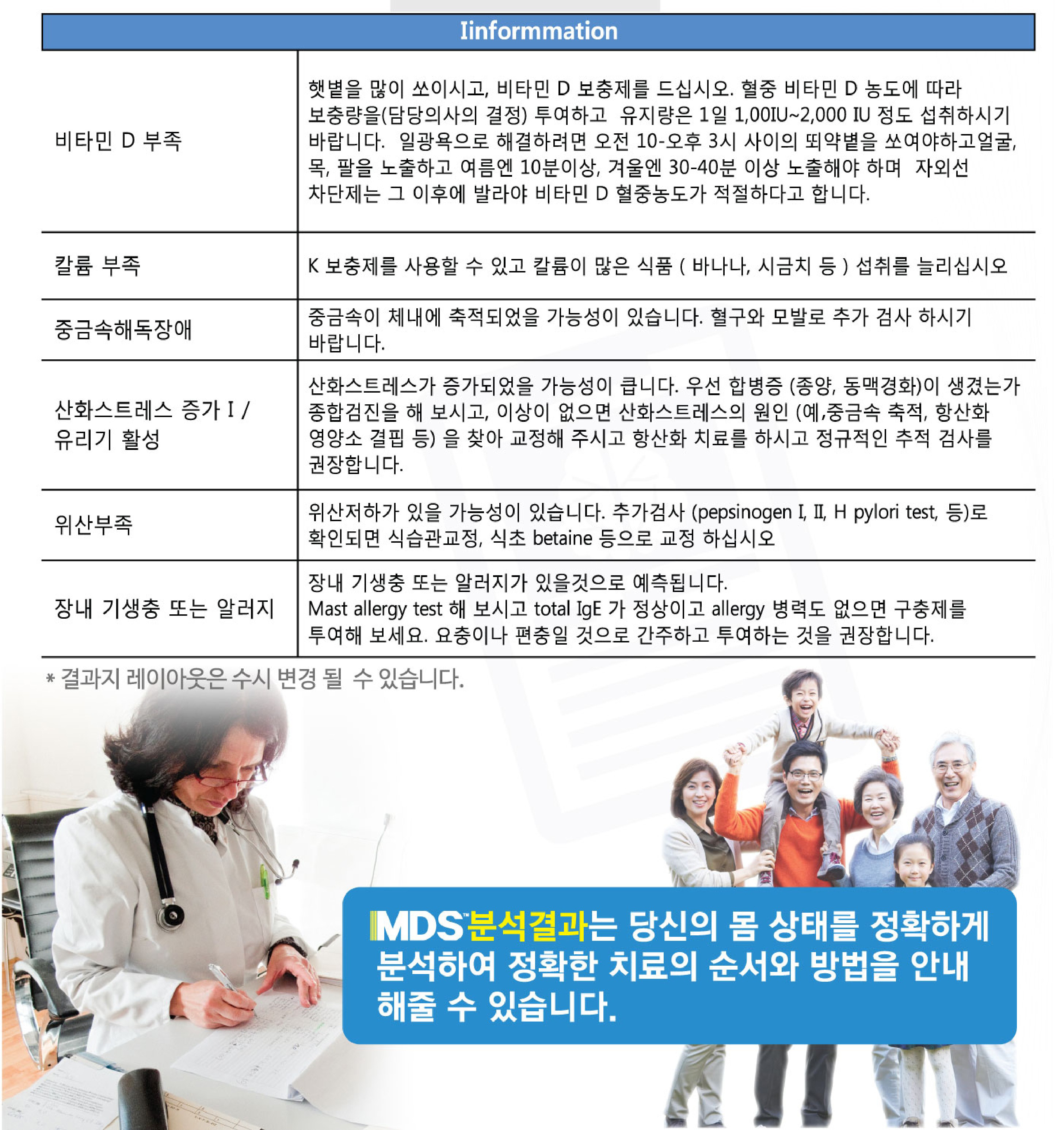 1차 스크린검사로 이용 가능하며, MDS 결과를 바탕으로 추가적인 “영양처방이나 확인검사(추가검사)”등 수진자분들로 하여금 추가적인 기능의학 검사 및 진료에 대하여도
