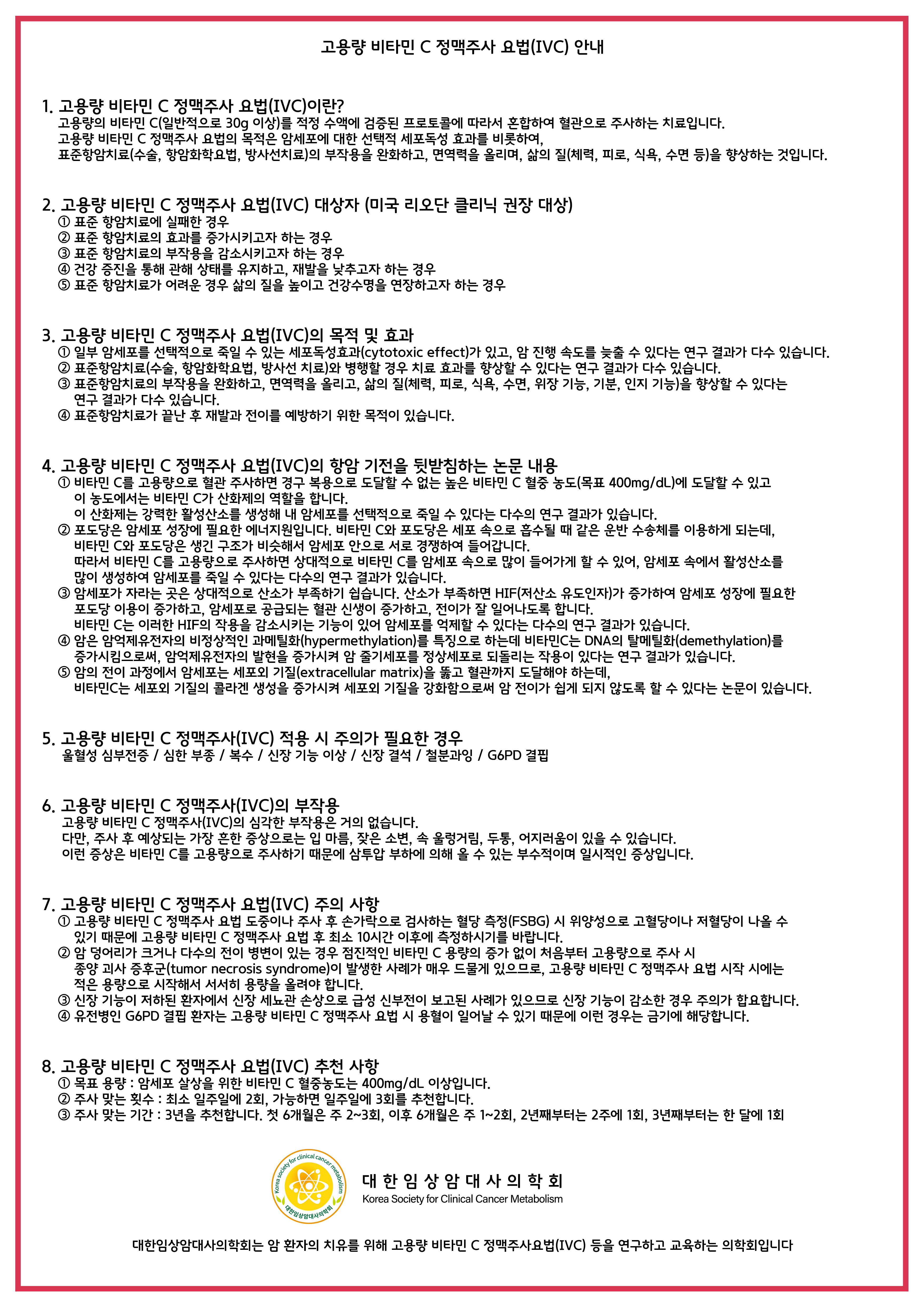 고용량 비타민C 정맥주사 투여를 받을 수 있는 환자의 기준